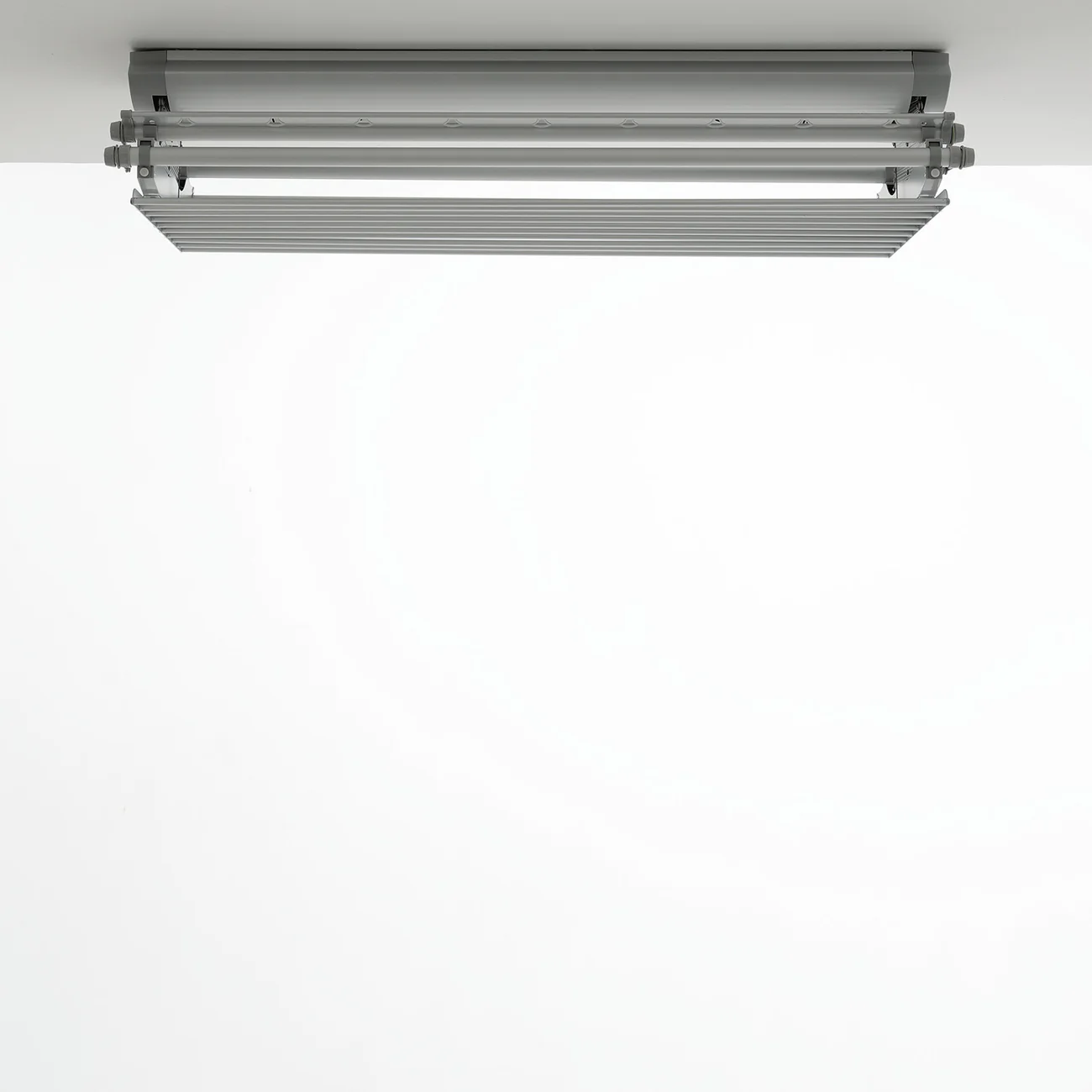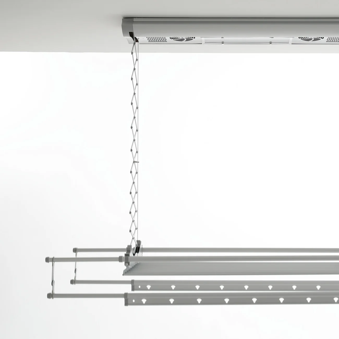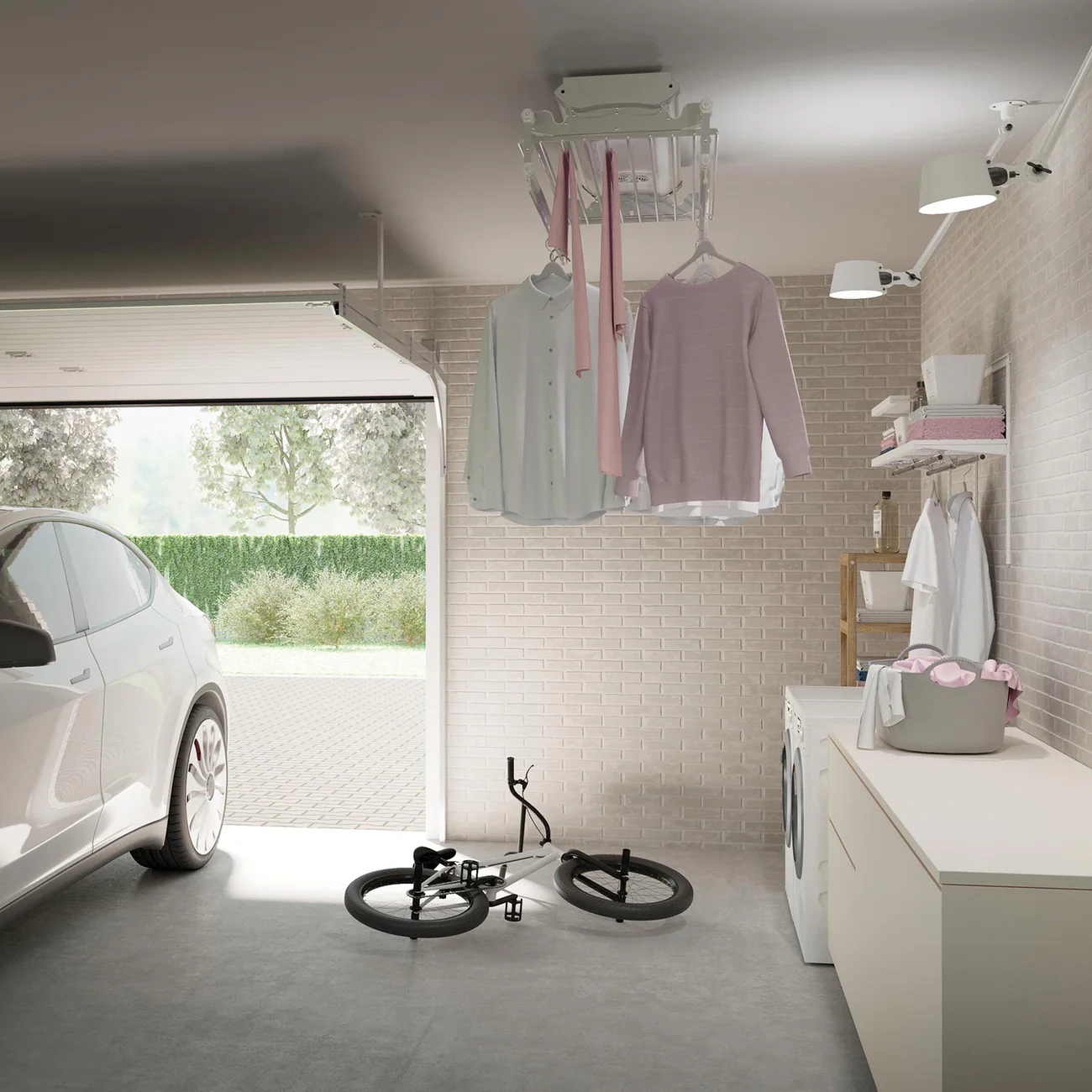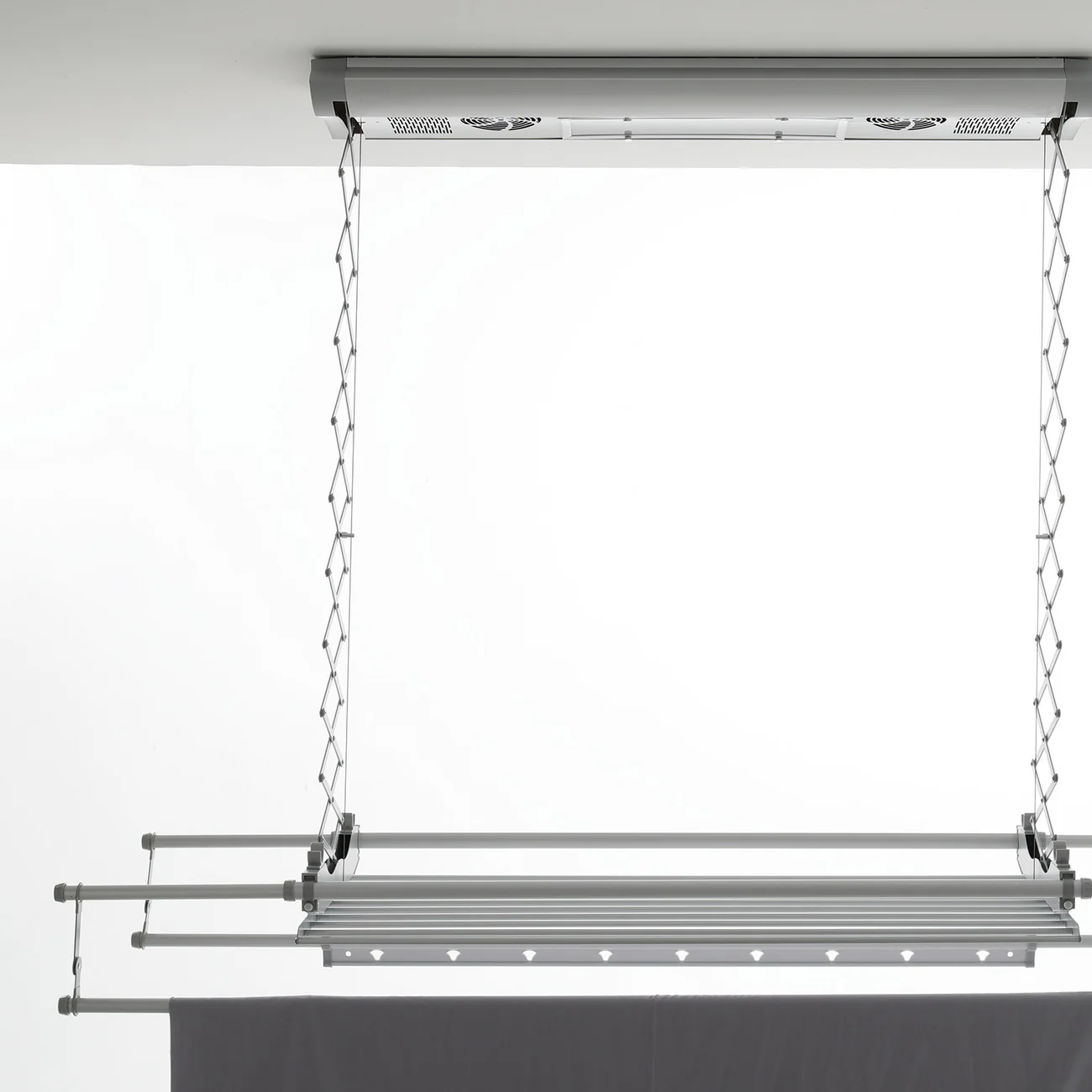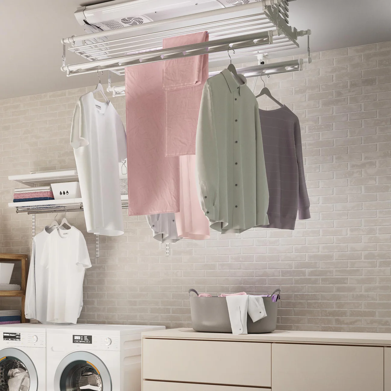 Controlled easily with a remote, you can lower the rack up to 180 cm from the ceiling and stop it at any height, making laundry days simpler and more efficient.
