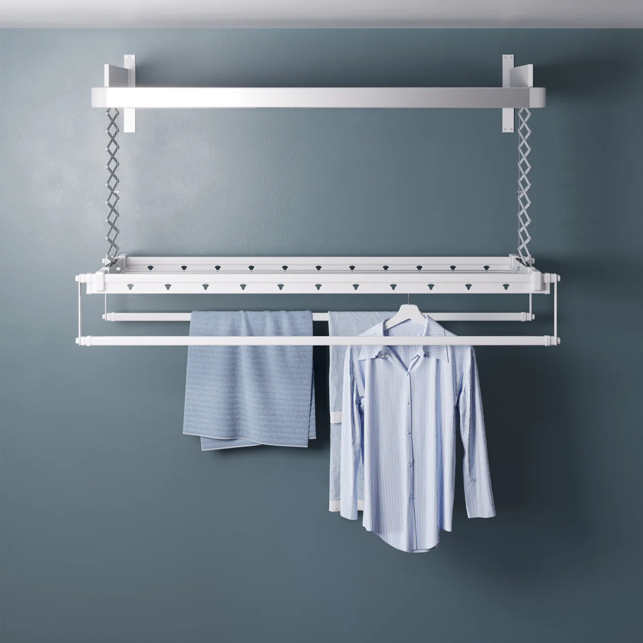 Operated via remote control, the rack can be lowered up to 180 cm from the wall and stopped at any height, making laundry days simpler and more efficient.